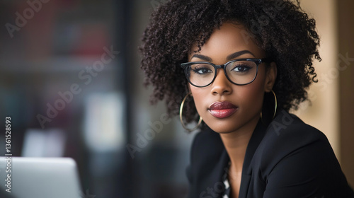 woman, portrait, curly hair, goggles, blazer, black, earring, jewellery, lipstick, make-up, professional, business, office, laptop, desk, indoor, fashion, style, beauty, elegant, confident, attractive, adult, female, african american