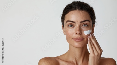 woman, young, adult, portrait, beauty, skincare, cream, freckled, smooth, radiant, healthy, natural, glowing, face, closeup, minimal, elegance, make-up, fresh, clean, indoor, studio, white background, 1, people, lifestyle, wellness, cosmetic, modern, make-up, moisturiser, beautiful, female, attractive, background, care, treatment, isolated, skin, facial, applying, pretty, smile, smiling, model, person, fashion
