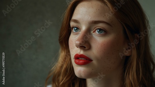 Portrait of a woman with light brown hair, red lips, and freckles, gazing softly into the distance.