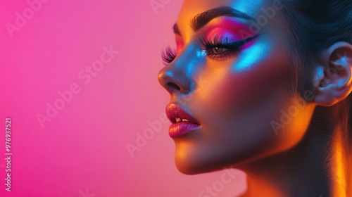 woman, face, portrait, make-up, eye, lip, skin, neon, colours, fashion, beauty, model, studio, lighting, glow, bright, colours, intense, high-coloured, glamour, style, artistic, modern, colourful, contemporary, shadow, highlight, dramatic, bold, eyeliner, eyebrow, eyelash, pink, blue, orange, yellow, purple, red, magenta, cyan
