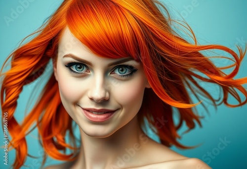 photo, image, eye, colours, mischief, people, human, unconventional, colours, gradient, expression, strong, shoulder, smile, easy, subtile, portrait, emotional, insertion, orange, sharp, background, woman, hair, face, vibrant, blue, unique