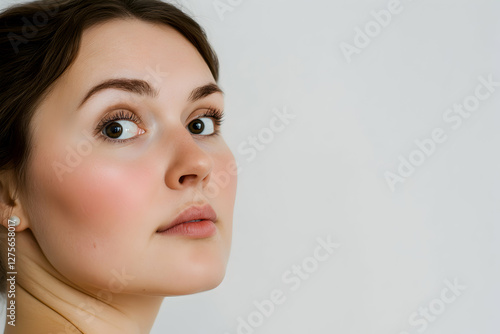 Portrait of a woman with striking features and natural makeup against a minimalist background