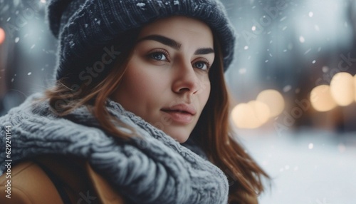 Portrait of a women in winters snow fall on the background
