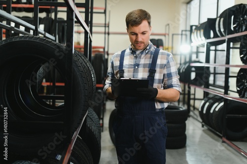 Portrait of a worker in a new car tire shop. Concept of changing tires