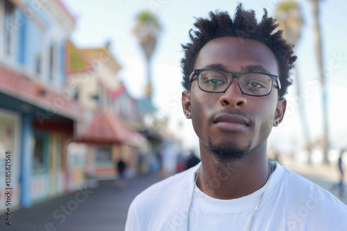 Portrait of a young African American man on the boardwalk in Los Angeles