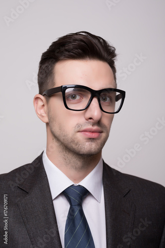 Portrait of a young and fashion businessman with nerd glasses on gray