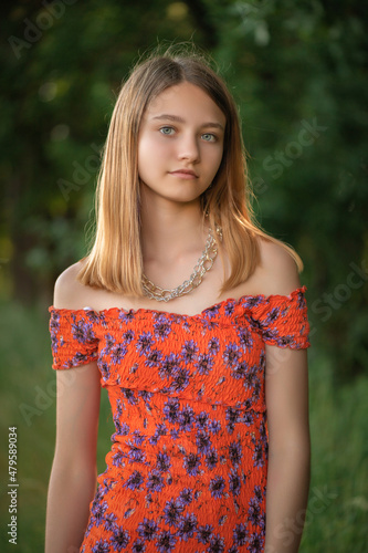 Portrait of a young beautiful blonde girl in the park in a red dress.