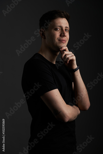 Portrait of a young, charismatic, handsome guy on a black background. Smiling and looking into the frame. Empty space for text.