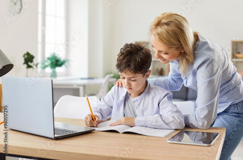 Portrait of a young child boy studying online class on laptop with his cheerful smiling mother at home. Woman help her son with homework during remote lesson. Distance education concept.