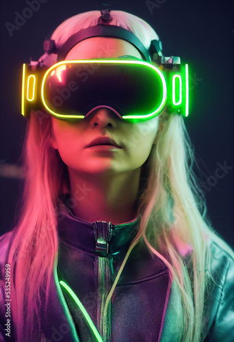 portrait of a young girl wearing virtual reality glasses, futuristic style, steampunk, cyberpunk, post-acalypse, 3d rendering