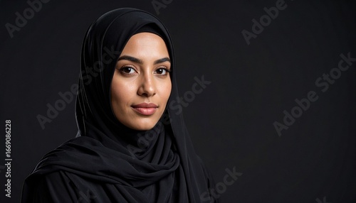 Portrait of a young lady wearing an all-black hijab and burka from head to toe, set against a pitch-black background with soft studio lighting, captured in a cinematic and elegant shot