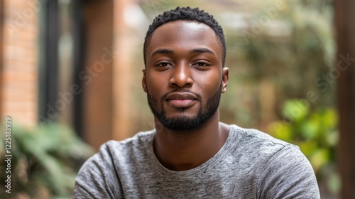 Portrait of a young man with a beard wearing a grey shirt in a natural outdoor setting with soft focus background and ample Copy Space