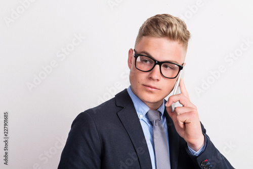 Portrait of a young man with smartphone in a studio, making a phone call.