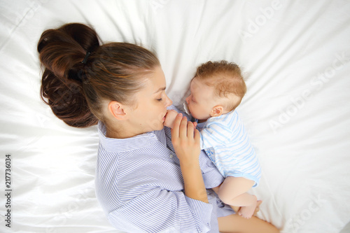 Portrait of a young mother and her sleeping 3 month old baby on the bed, concept of a shared dream. Top view