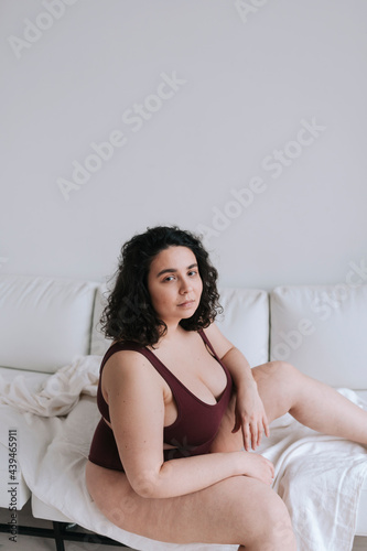 adult, home, beautiful, bed, bedchamber, bra, brunette, caucasian, comfort, comfortable, confidence, confident, curly, enjoyment, female, glamour, gorgeous, harmony, home, indoor, leisure, lifestyle, lingerie, looking, mindfulness, morning, natural, corpulent, portrait, pretty, relaxation, room, satisfaction, sensual, sensuality, sexy, sitting, sofa, style, top, trendy, singlet, underclothing, woman, young