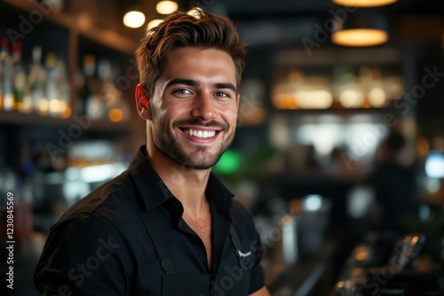 portrait, young, smiling, german, male, barkeeper, blurred, bar, background, happiness, profession, job, occupation, men at work, serving, alcohol, drink, casual attire, uniform, confident, friendly, photogenic, personable, cheerful, professional, service, pub, eatery, employee, client, social, event, party, occasion, celebration, night, lifestyle, career, industry, leisure, hospitality, caucasian, standing, indoor, face, man