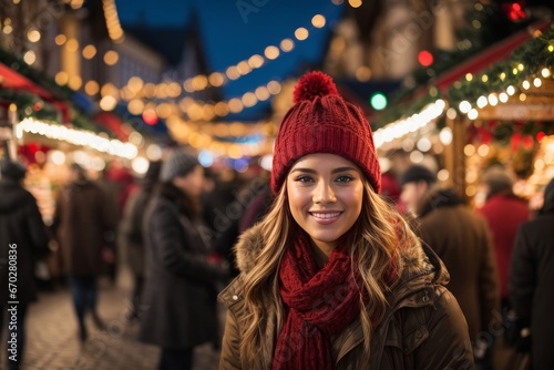 Portrait of a young woman at the Christmas market with lights and decorations that give it a magic. The atmosphere is cheerful and welcoming, inviting you to enjoy tradition and the Christmas spirit.