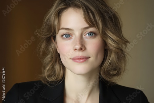 woman, portrait, face, eye, blue, hair, brown, wavy, young, female, model, person, head shot, closeup, studio, professional, neutral, expression, black, blazer, soft, lighting, natural, make-up, freckle, light, skin, shoulder, length, casual attire, beautiful, attractive, pretty, elegant, confident, calm, serene, peaceful, relaxed, authentic, genuine, real, candid, simple, clean, minimal, blurred