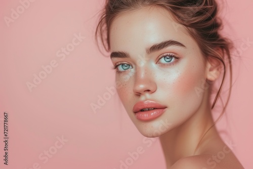 Portrait of a young woman with flawless makeup, highlighting her radiant and perfectly smooth skin on a soft pink background.