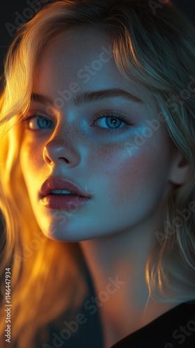 portrait, young, woman, blue, eye, blond, hair, gold, light, soft, lighting, intimate, setting, serene, expression, beauty, glowing, skin, warm, tone, natural, emotional, gaze, radiant, complexion, play, captivating, subtile, colours, gentle, shadow, texture, expressive, feature, effect, portraiture, fashion, aesthetic, model, elegance
