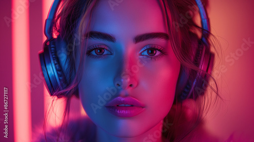 Portrait of a young woman with headphones, illuminated by vibrant neon lights, enjoying music and exuding a modern, stylish vibe