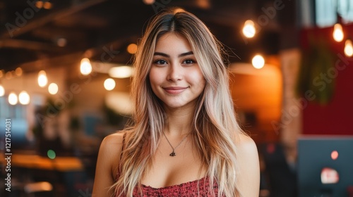 Portrait of a Young Woman with Long Blonde Hair Smiling in a Trendy Cafe