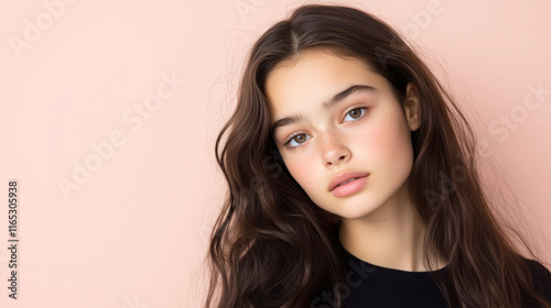 pretty, model, elegant, natural, make-up, beauty, delicate, serene, face, portrait, gaze, girl, eye, looking, pink, youthful, confident, brown, feminine, young, expression, woman, soft, stylish, head shot, attractive, pose, gentle, long, hair, light, studio, background, peaceful, calm, photo, female
