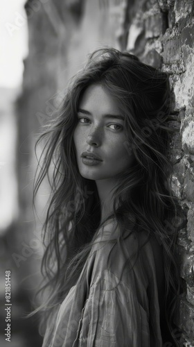 woman, portrait, face, eye, hair, freckle, model, beauty, fashion, photo, black-and-white, studio, lighting, pose, expression, serious, contemplative, thoughtful, introspective, serene, calm, peaceful, quiet, still, silent, motionless, undisturbed, tranquil, composed, unruffled, untroubled, relaxed, cool, collected, poised, confident, assured, self-assured, self-assured, certain, convinced, positive, affirmative, upbeat