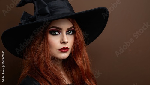 Portrait of a young woman with long red hair and dramatic makeup wearing a black witch's hat, celebrating Halloween with a gothic style and a mysterious expression.