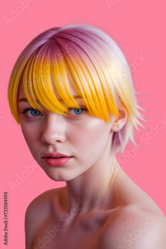 Portrait of a young woman with multicolored hair.