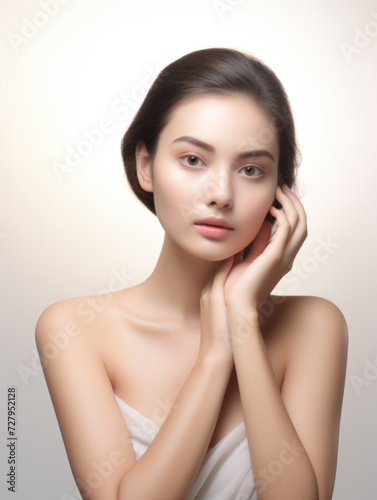 Portrait of a young woman with natural makeup and natural styling.Cosmetology,beauty and Spa Happy beautiful girl holding her cheeks with a laugh looking to the side.Pretty woman clean fresh skin.