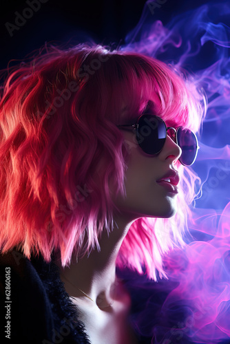 Portrait of a young woman with pink hair and dark sunglasses, with pink and blue smoke on a black background. Cyberpunk style