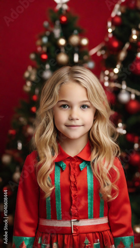 Portrait of adorable little girl in the festive Christmas clothes with Christmas tree in the background, winter holiday season