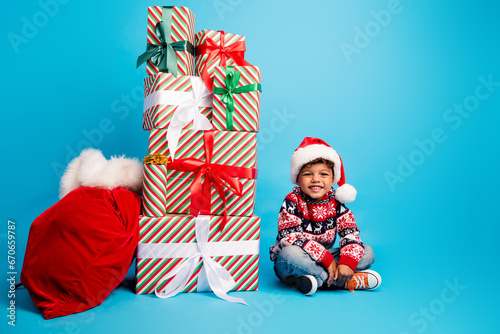 Portrait of adorable little kid wear red ornament pullover jeans santa hat sitting with gift boxes isolated on blue color background
