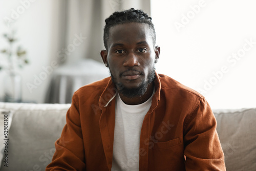 Portrait of african american guy sitting on couch in living room interior and looking at camera, headshot closeup