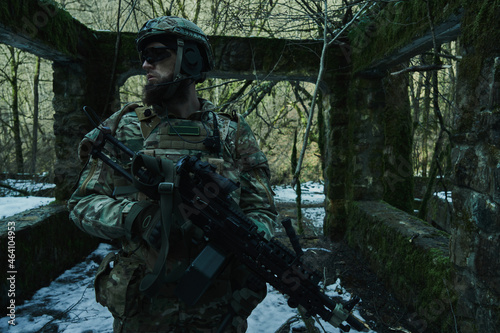 Portrait of airsoft player in professional equipment with machine gun in the forest. Soldier with weapons at war