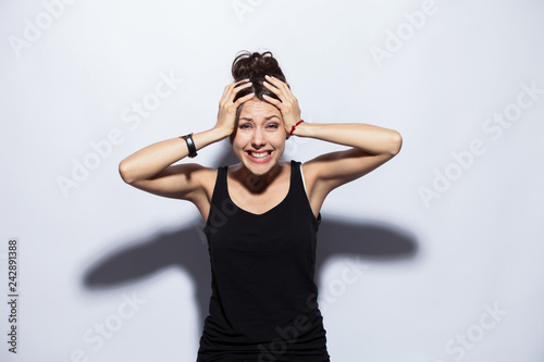 amazed, girl, people, young, beautiful, female, excited, attractive, surprise, woman, background, isolated, adult, mouth, white, arm, casual attire, excitement, hand, shouting, expression, winner, portrait, studio, shocked, bright, brunette, cute, success, high-coloured, shock, face, lady, looking, person, scared, afraid, screaming, succeed, colours, wall, covering, cosy, overwhelmed, fear, caucasian