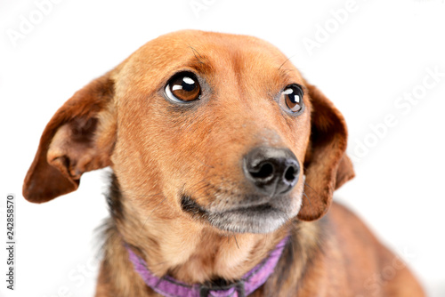 adorable, alone, animal, attention, beauty, bred, canino, collar, cute, dog, domestic, ear, eye, friendly, hound, isolated on white, lovely, mammal, mixed, nobody, nose, one animal, pet, portrait, purple, sad, sorrowful, shy, smart, studio, studio shot, sweet, trust, vertebrate, white background