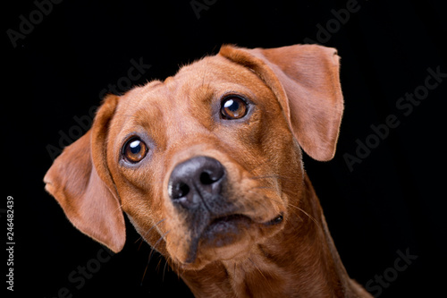 adorable, alone, animal, attention, beauty, black background, bred, canino, curious, cute, dark background, dog, domestic, ear, eye, friendly, front view, hound, indoor, listening, lovely, mammal, mixed breed, mouth, nobody, nose, one animal, pet, portrait, serious, smart, studio, sweet, trust, vertebrate