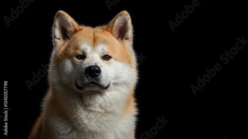 Portrait of an Akita Inu dog on a black background, highlighting its dignified appearance. Ideal for dog, breed, and Japanese dog content.
