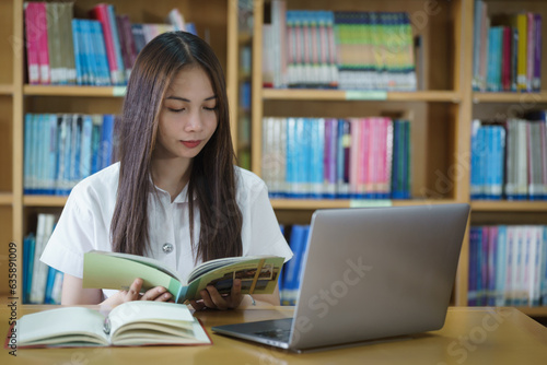 Portrait of an Asian girl college student studying in library doing project assignment and preparing for examination