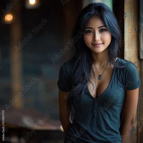 woman, portrait, asian, long hair, realistic, photo, beauty, model, face, smile, studio, fashion, lifestyle, elegance, female, attractive, expression, hair, eye, skin, head shot, person, young, background, casual attire, style, confident, pose, closeup, natural, light, colours, emotion, appearance, gorgeous, serene, charming, glamourous, vibrant, feminine, graceful, artistic, candid, creative