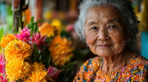 Portrait of an Elderly Asian Woman Amidst Vibrant Flowers