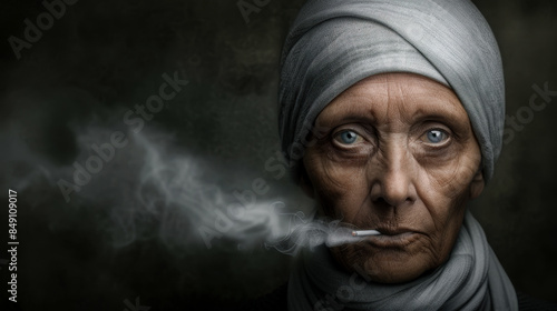 portrait, elderly, woman, smoking, cigarette, capturing, deep, wrinkle, intense, eye, winter, clothing, striking, image, lifetime, story, wallpaper, digital, art, poster, brainstorming, map, mag, background, cover, aged, character, life events, expression, depth, texture, realism, evocative, weathered, gritty, poignant, timeless, rugged, authentic, atmospheric, narrative, storytelling, emotional, impact, thoughtful, contemplative, lifestyle