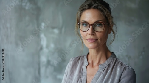 Portrait of an elegant middle aged woman wearing glasses, expressing confidence and poise against a textured grey backdrop in a studio setting