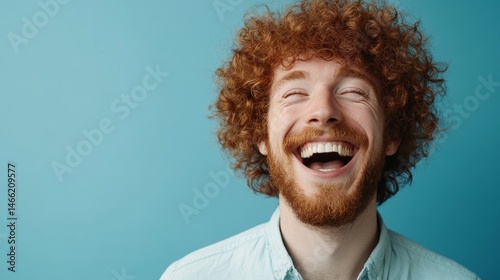 Portrait of an energetic curly haired man smiling radiantly while conveying joy and positivity