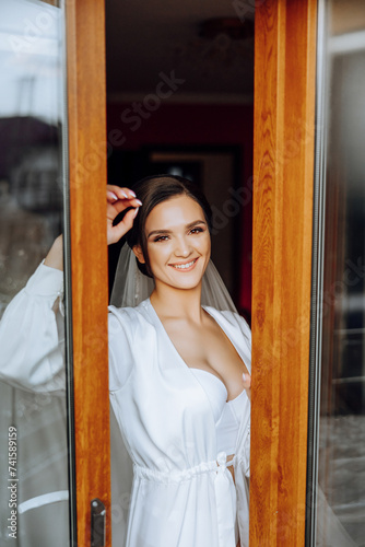 portrait of an incredibly beautiful girl bride in a white robe in the bedroom, the bride poses in the morning before the wedding ceremony.