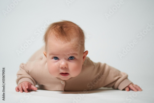Portrait of an infant learning to crawl on a white background