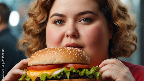 portrait, overweight, woman, preparing, eating, delicious, cheeseburger, unhealthy, concept, food, fast, temptation, diet, lifestyle, weight, nourishment, tasty, enjoyment, mealtime, culinary, craving, greasy, delight, decadent, satisfaction, obesity, guilt, hunger, tempting, high-calorie, snack, overeating, fat