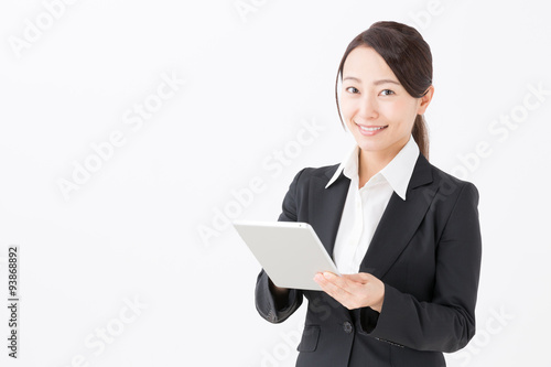 woman, tablet, ol, career woman, people, alone, smile, mobile, net, work, work, working girl, beauty, young, suit, black hair, long hair, ponytail, japanese, asian, chinese, white, copy space, cut-out, background